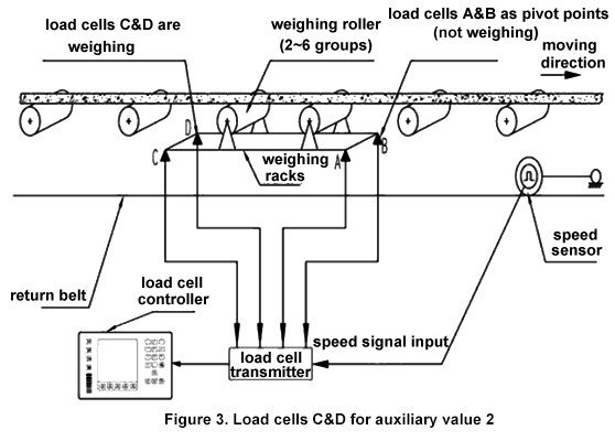 Taking the variable belt scale as an example whose full suspension scale rack is supported by four beam load cells, the belt scale divides four load cells into four independent signals which then enter the digital transmitter on site, the digital transmitter converts weighing analog signal into digital signal and convey it to the load cell controller. By grouping the four independent weighing signals respectively and combining the signal of speed load cell, the load cell controller would calculate the cumulative and instantaneous flow of three groups of feeding medium, namely one group of main value and two groups of auxiliary value.